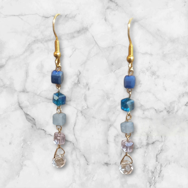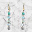 A beautiful array of colourful glass, including a vibrant green at the top and delicate shades of blue and crystal towards the bottom, these earrings catch the light beautifully.