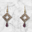 Featuring a delicate, openwork square frame with intricate floral patterns, these earrings add a touch of refined elegance to any look. A vibrant purple teardrop crystal dangles gracefully below, creating a captivating focal point.