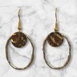 The top part has a textured, round piece, while the lower section consists of a larger, irregularly shaped hoop. Lightweight and comfortable, they feature a secure hook closure for easy wear.
