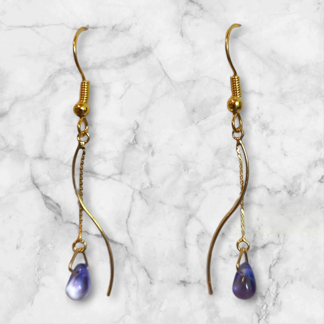 Adorn yourself with these exquisite drop earrings, featuring captivating bluish purple glass. The delicate teardrop shape of the glass beautifully complements the graceful curves of the gold-toned wire, creating a harmonious and elegant design.